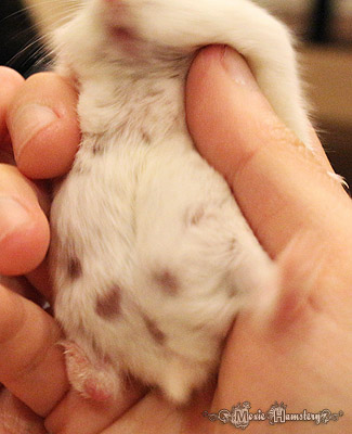 6. Hai hàng vú xếp thẳng hàng : Dấu hiệu này cũng dễ thấy vào mấy ngày trước lúc Hams mẹ sinh. Trước đây đầu vú của Hams mẹ do bị lông che phủ nên không nhìn thấy rõ còn bây giờ chúng ta sẽ dễ dàng thấy được. Hams mẹ có 8 đầu vú, phân bố gần tứ chi, mỗi bên có 2 cái và đối xứng đều 2 bên. Nhưng lúc mang thai chúng ta chỉ nhìn thấy 6 đầu vú bên dưới, mỗi bên có 3 cái, giống như hàng nút xếp thẳng hàng ở những kiểu y phục cũ. Nhưng đừng có cho rằng lúc nhìn thấy hiện tượng này là Hams mẹ mang thai vì lúc chuột rụng lông thì chúng ta cũng dễ dàng nhìn thấy đựơc đầu vú.